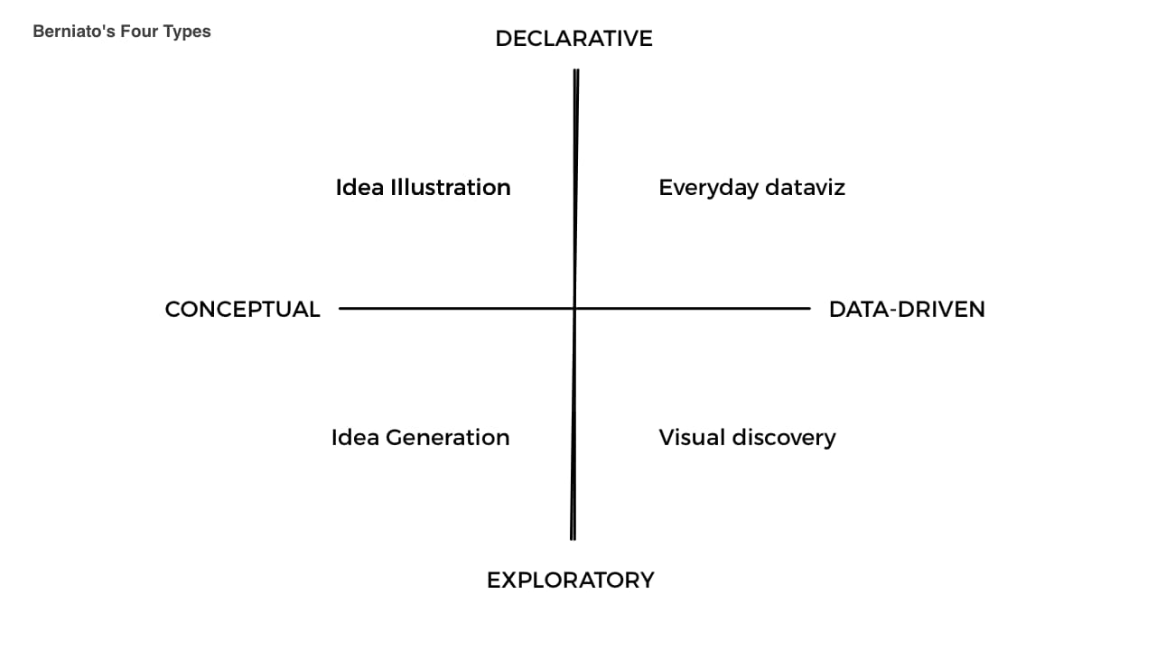 Scott Berinato, in his book Good Charts, proposed four types to visualize data: Conceptual-declarative, conceptual-exploratory, data-driven-declarative, and data-driven-exploratory.