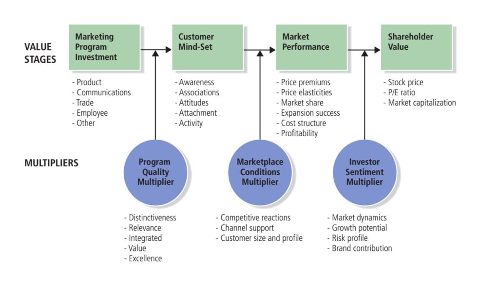 The Brand Value Chain Model also proposed by Kevin Lane Keller & Vanitha Swaminathan in the book Strategic Brand Management: Building, Measuring, and Managing Brand Equity (P98 Figure 3-5) explained that a brand is created in different stages with multiple factors named multipliers that can “multiplies to the next stage”